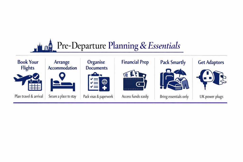 The UK’s weather is temperate but variable. Bring some warm clothing and a waterproof coat or umbrella, as rain is common year-round. For PhD students, there’s no formal “uniform,” but packing a mix of casual wear and a few smarter outfits (for conferences or formal events) is wise. Don’t overpack things that you can easily buy in the UK (like basic bedding or kitchen items if you’ll move into furnished student accommodation) – save luggage space for personal and important items. If you will live in university halls, check what is provided; often you may need to buy kitchen utensils or bedding, but you can get these after arrival. Some universities even offer “arrival packs” with bedding/kitchen essentials for international students to purchase, so check if that service exists. Lastly, remember UK electrical outlets are unique (three-pin plugs and 230V supply), so bring a couple of plug adaptors for your laptop and phone chargers.
