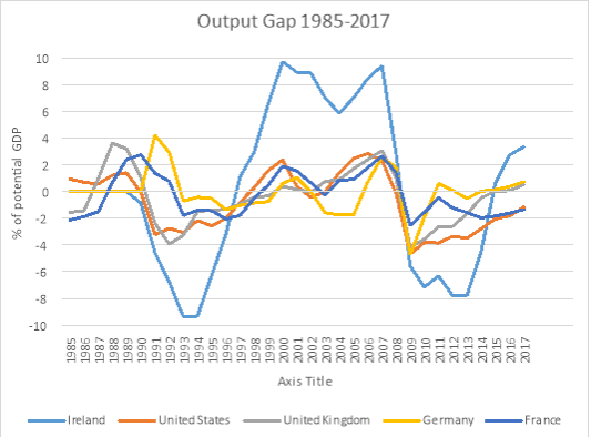 Figure 1: Economic Outlook: The output gap (deviations of actual GDP from potential GDP as % of potential GDP) of selected industrialised economies on the course of 1985 to 2017. Data extracted from OECD Statistics.