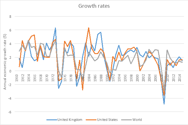 Figure 2: The growth rates in UK, USA and the world over the course of the last five decades. Data extracted from WorldBank