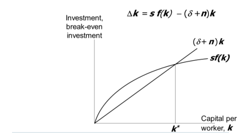 The Solow Growth Model is dynamic, where the stock of capital changes over time and, thus, output changes over time (given that capital is the input). Capital per-worker is equal to the increase in new capital (investment or i) minus the depreciation of existing capital (d). Mathematically, ∆k = i – d = s– δk, where δ denotes the depreciation rate and ∆ denotes the change. This is the fundamental equation for the Solow Growth Model. The “steady state” version of the model, where new capital injections equal capital depreciation, denoted as k*, the ∆k = 0, since s– δk* = 0. In this state, there is no economic growth in per-worker output. See figure 3.