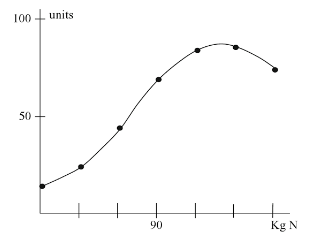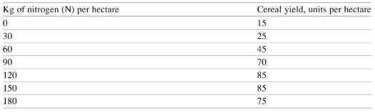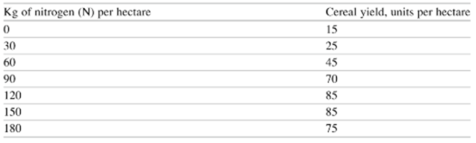 Ultimately, the business here is able to increase production of cereal by increasing the input of nitrogen. Since the curve above is not linear, there is the expectation that the relationship between inputs and outputs is not constant. This brings into discussion the concept of diminishing returns. For instance, if we consider the table above, we can see that increasing the amount of nitrogen used from 60 to 90 brings about a 25-unit increase in cereal production, from 45 to 70. However, increasing the use of nitrogen further, another 30KG increase to 120 only brings about a 15-unit increase in cereal production.