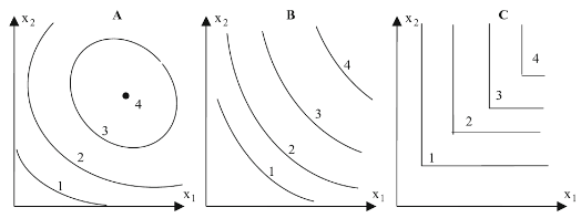 Essentially, each line represents a level of output from the business, which each point on the line a combination of the two inputs which can be used to produce the given level of output. However, each graph showcases a different relationship. For instance, in ‘A’ it could be noted that line 1 shows that it is possible to produce the product/ service with just one output involved, however a combination of the two can also be used. In ‘B’, both inputs are necessary for the output, however there is no maximum, and so this could be thought of as a Cobb-Douglas production function.